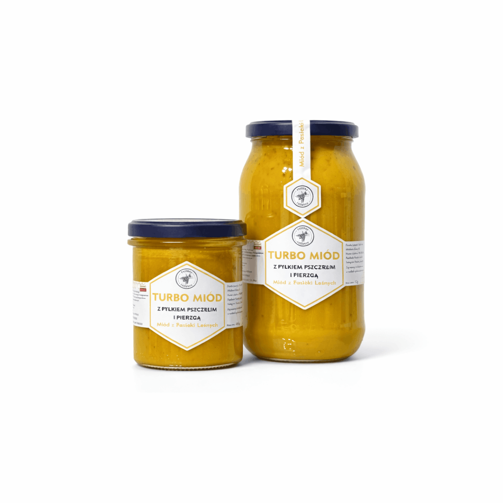 Turbo Miód to najbardziej odżywcza odsłona miodu w naszej ofercie. Powstaje z połączenia kremowanego miodu wielokwiatowego z dwoma wyjątkowymi produktami pszczelimi: pyłkiem pszczelim oraz pierzgą. To naturalna kompozycja dla osób, które sięgają po miód nie tylko dla smaku, ale przede wszystkim dla jego wartości.
